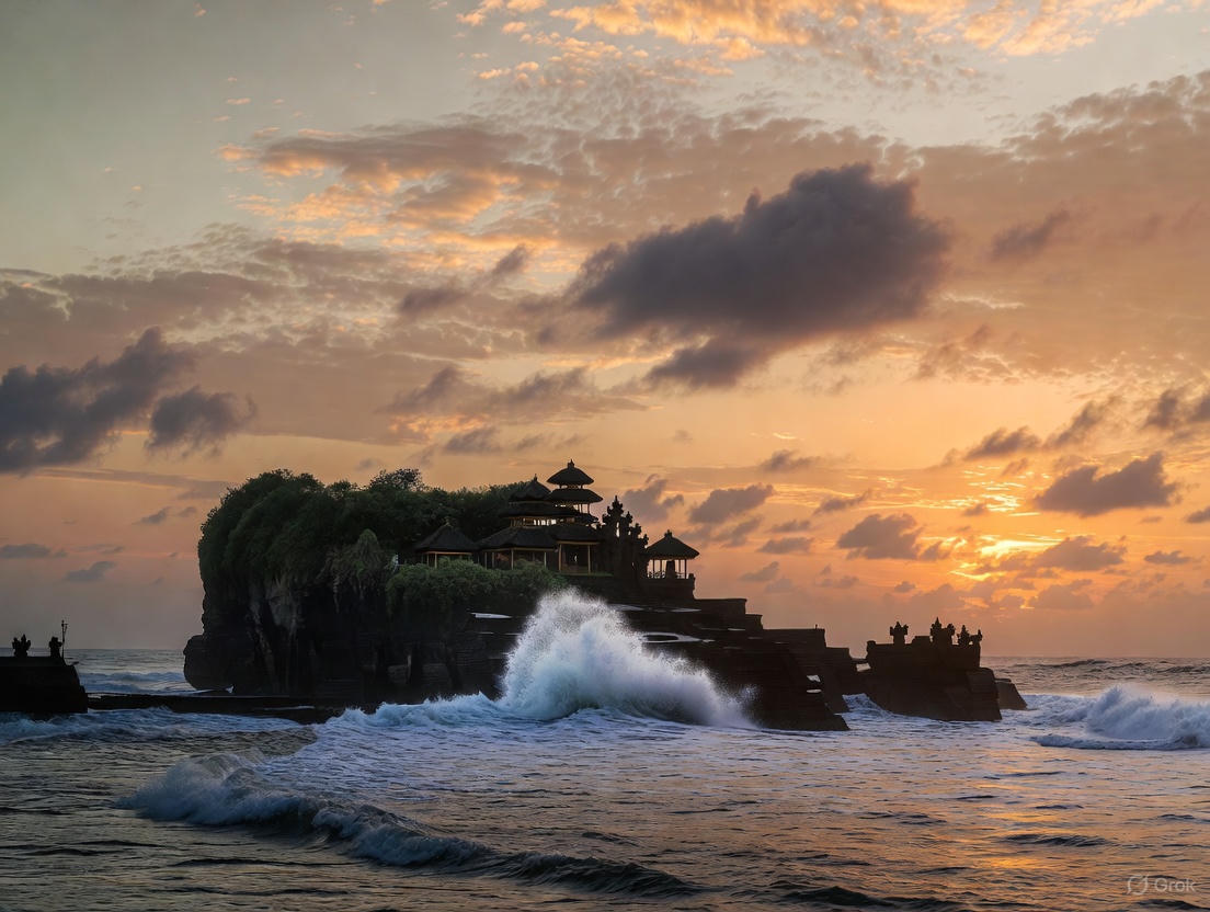 • Tanah Lot Temple is situated at the shore, dramatically perched on a rocky outcrop amidst crashing waves.